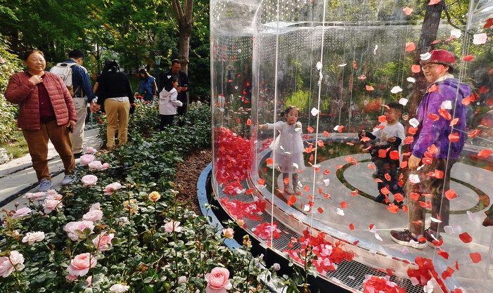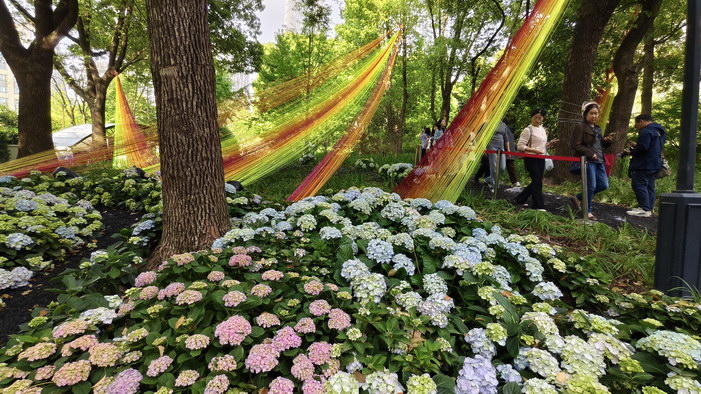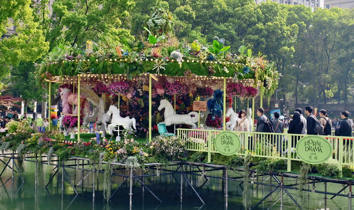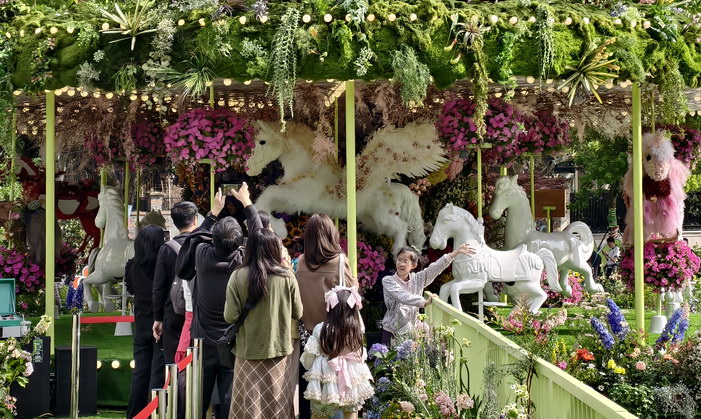 为期一个月的上海国际花展今年首次升级为“国际花卉节”,在黄浦新天地太平湖城市公园成主会场,近30组全球花匠打造的鲜花园林艺术景观汇聚成“世界花园”,双休假期吸引众多市民游客CITYWALK打卡拍照。包括应景马年的怀旧童年水上旋转木马、流浪猫童话城堡、白玉兰皇冠、沉睡在绣球花中的树懒、时间玫瑰喷气花瓣装置、浪漫万花筒等园艺景点空间,从静态赏花观景到沉浸式互动体验,从现代花艺到传统花神文化,充满想象力的作品不仅视觉享受,也于生机盎然中传递治愈疗愈身心、人类与自然环境和谐包容、共享共生的美好生态,花海融入都市商圈也推动了文商旅体展深度融合,带动“花经济”文旅消费新场景。