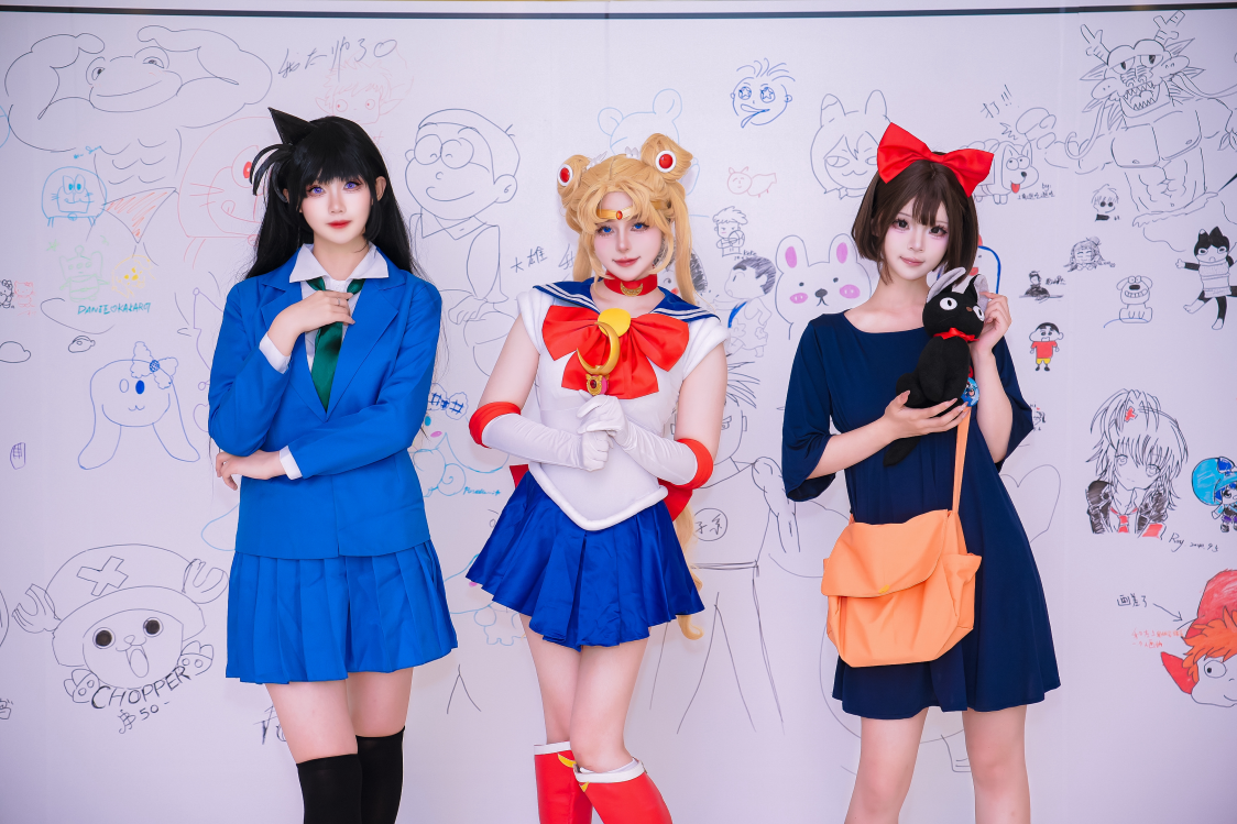 【手绘墙附近的coser毛利兰(左)、月野兔(中)、琪琪(右)】