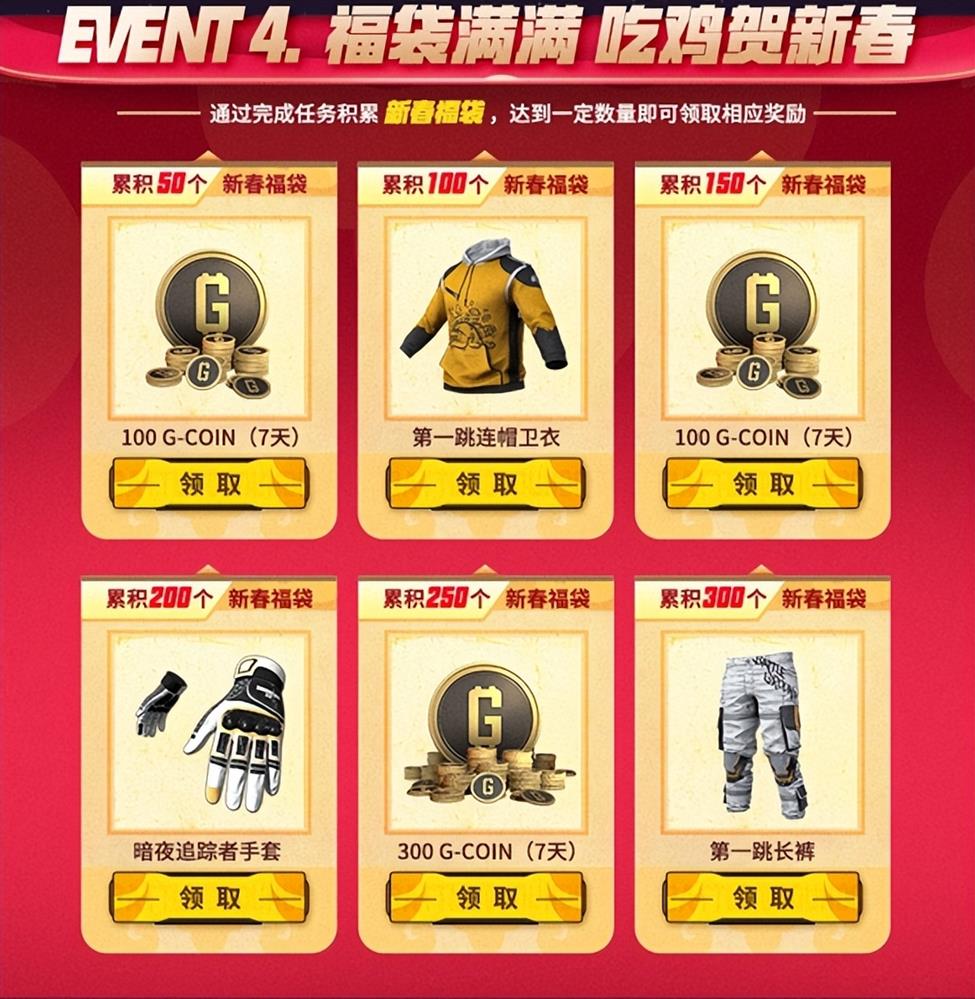 活动4:福袋满满 吃鸡贺新春:积累新春福袋,可兑换多款珍稀道具和皮肤。首次上线的连帽卫衣,长裤和暗夜追踪者手套让你的角色焕然一新,迎接新春的到来。