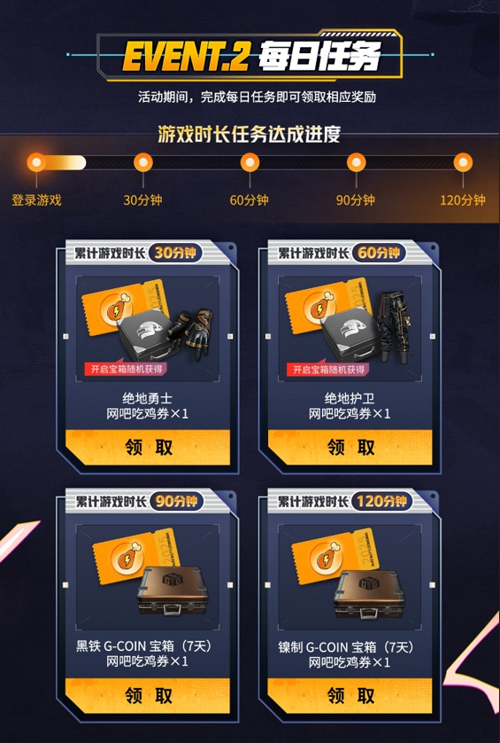 活动2:每日任务:完成每日设定的游戏时长任务,即可获得网吧吃鸡券及游戏宝箱,宝箱中有可能开出游戏道具!