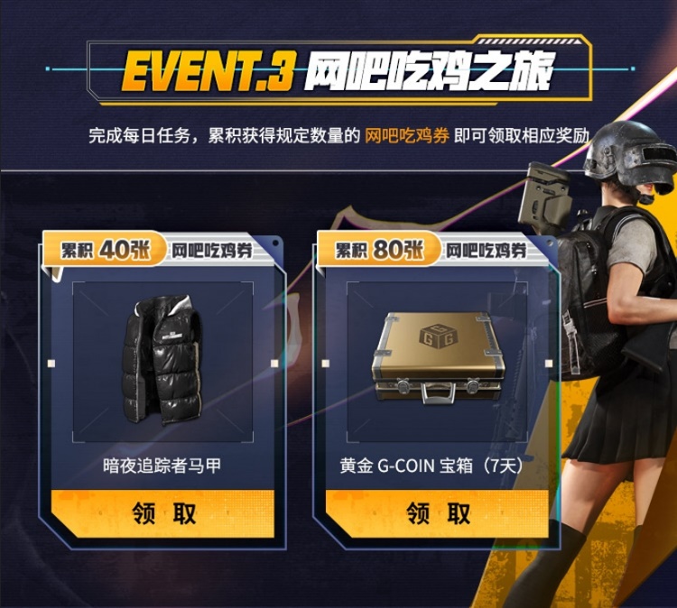 活动3:网吧吃鸡之旅:积累网吧吃鸡券,可兑换新上线皮肤暗夜追踪者马甲及黄金宝箱。