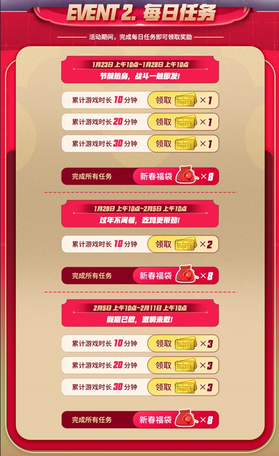 活动2:每日任务:完成每日设定的游戏时长任务,获得抽奖券的同时,还可获得新春福袋;