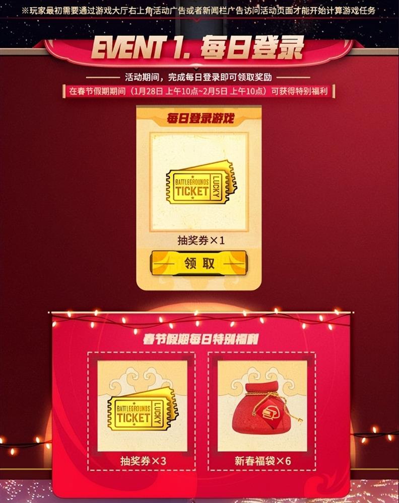 活动1:每日登录:活动期间,玩家每天登录游戏即可领取抽奖券,春节(1月28日10:00-2月5日10:00)期间登录还可额外获得新春福袋;