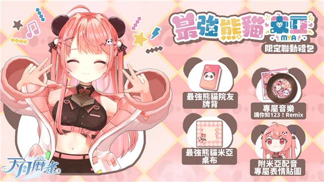 《天月麻雀》于此次版本更新中公布全新联动,邀请到本次为新雀士「妲己」配音的的香港Vtuber 米亚Mya 合作,推出限定礼包【最强熊猫米亚】。礼包中将包含两首联动音乐、两款限定表情及米亚Mya 主题装饰物套组。此外,本次联动更会送出两款联动表情及立直棒,详情将会于《天月麻雀》社交平台公布。