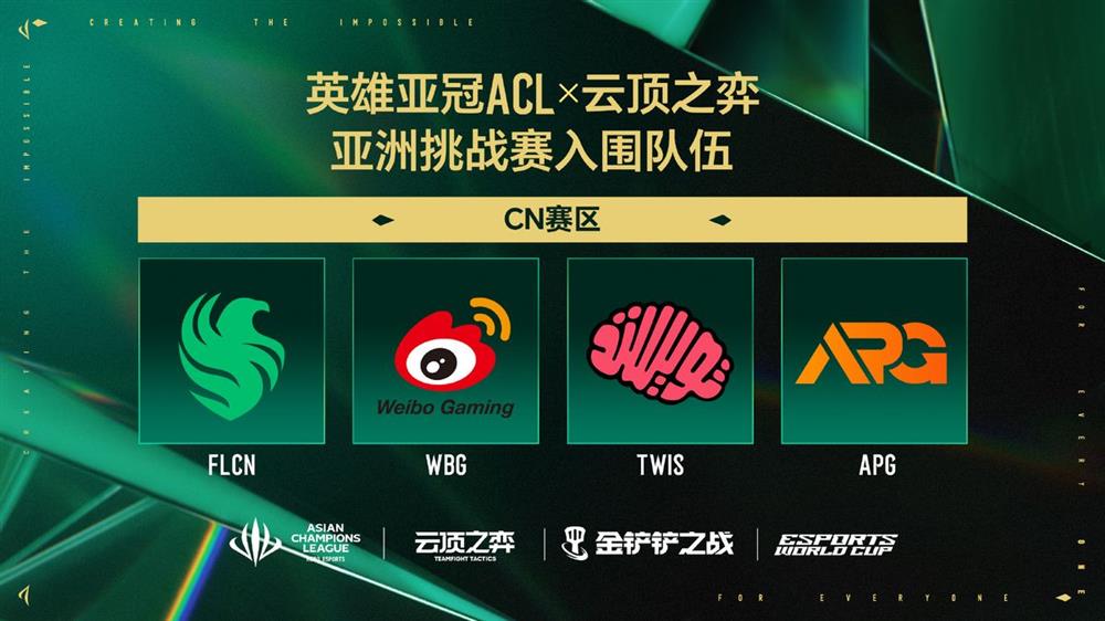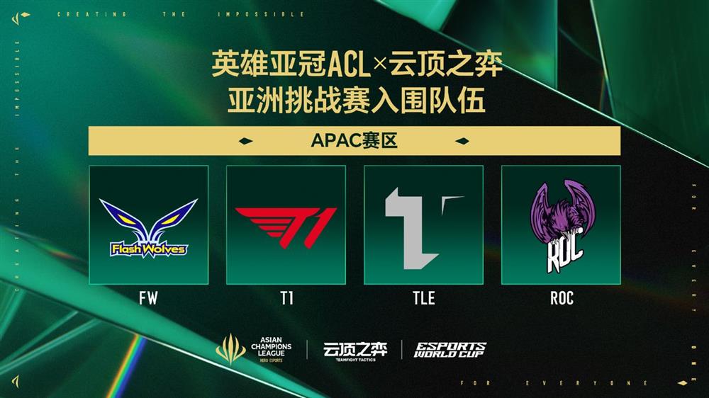 英雄亚冠ACL x云顶之弈亚洲挑战赛将于5月8日在上海外滩中央广场启动,CN与APAC赛区通过区域预选赛已决出6支EWC晋级队伍:APAC赛区Flash Wolves、T1电子竞技俱乐部、Virtus Pro(改名前Tulip Esport),CN赛区Team Falcons、微博电子竞技俱乐部、Twisted Minds。两赛区第四、第五名则获得EWC“最终资格赛”(LCQ)直邀名额。