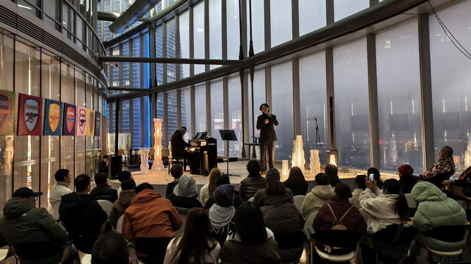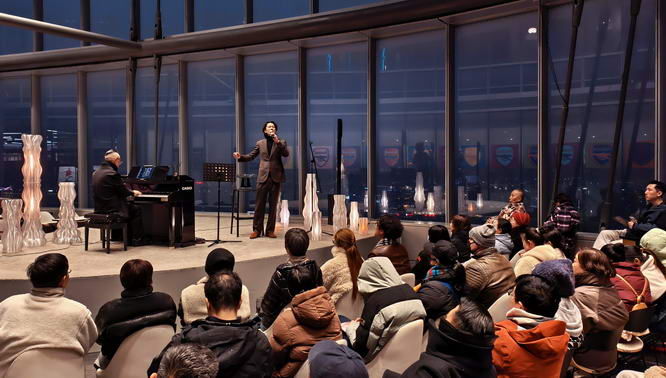 黄健怡是上海爵士界标杆人物,其演奏兼具古典底蕴与爵士即兴的灵动;刘可夫曾获《星光大道》周冠军,以温暖醇厚的音色和充满个人风格的即兴演绎著称。朵云书院不止是阅读爱好者和旅游达人的网红文旅地标,也成为文化艺术家们在239米高空展现自己的“云端舞台”。